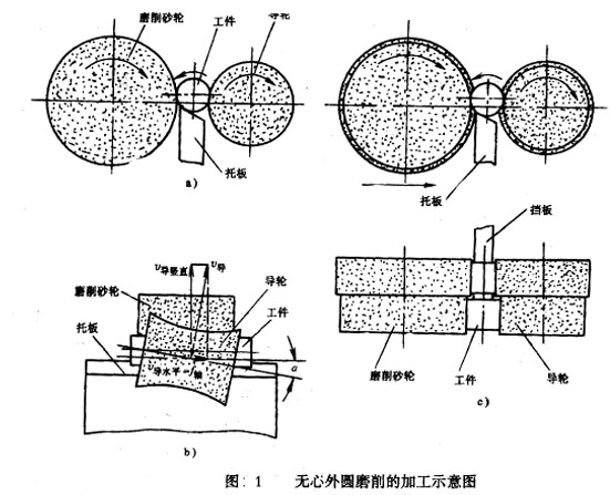 無心外圓磨床是一種特殊的外圓磨床。在無心處圓磨床上磨削工件外圓時,工件不用頂尖來定心和支承,而是直接將工件放在砂輪子和導(dǎo)輪子之間,由托板支承,工件被磨削的外圓面作定位面,如圖1所示。