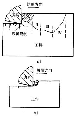 硬脆非金屬材料主要有工程陶瓷、玻璃及石材等。在使用金剛石刀具切削陶瓷時,可以觀察到被切削陶瓷在刀刃擠壓作用下,在刀刃附近產(chǎn)生裂紋,裂紋先向前下方擴展,深度超過切削深度,而后一邊前進一邊向上方擴展,作后穿過工件上部的自由表面,此時形成較大的薄片狀切屑,并在切削表面上留下凹痕(見圖1-8a),這種情況稱之為大規(guī)模擠裂。如果從這種狀態(tài)下繼續(xù)切削,實際切除的只是崩碎后的殘留部分,這時發(fā)生小規(guī)模擠裂,生成切削表面上較平滑的部分(見圖1-8b)。另外,由于刀刃后方的材料內(nèi)存在拉應力,所以在工件已加工表面上可能還會產(chǎn)生與表面大體相垂直的裂紋。在小規(guī)模擠裂發(fā)生以后,刀刃前方的材料就形成與切削表面近似垂直的形狀,切削深度再次變大,切削該部分材料時將再次發(fā)生大規(guī)模擠裂。大規(guī)模擠裂與小規(guī)模擠裂交替進行,工件材料就這樣被逐步切開。
