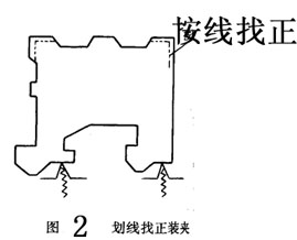 引法是先在毛坯上按照零件圖劃出中心線、對稱線和各等加工表在的加工線,然后將工件裝上機床,按照劃好的線找正工件在要床上的裝夾位置。如圖2所示車床床身毛坯,為保證床身各種壁厚均勻及各加工面的加工余量,先在平臺上將毛坯按圖劃好加工線,然后在龍門刨床工作臺上用千斤頂支起床身毛坯,用劃線盤按線的正后夾緊,再對床身毛坯底平面進行粗刨。這種裝夾方法生產率低,精底低,且對工人技術水平要求高,一般用于單件小批生產中加工復雜而笨重的零件,或毛坯尺寸公差大而無法直接用來具裝夾的場合。