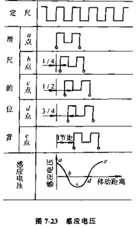 圖7-23所示為滑尺在不同位置時定尺上的感應(yīng)電壓,當定尺與滑尺繞組重合時,如圖中a點,這時感應(yīng)電壓最大。當滑尺相對于定尺平行移動后,感應(yīng)電壓便逐漸減小,在錯開1/4節(jié)距的b點時感應(yīng)電壓為零。再繼續(xù)移動到1/2節(jié)距的c點時,得到的電壓值與a點位置相同,但極性相反,隨后感應(yīng)電壓在3/4節(jié)距位置d點時又變?yōu)榱悖谝苿右粋節(jié)距到e點時,電壓幅值與a點位置相同。這樣滑尺在移動一個節(jié)距的過程中,感應(yīng)電壓變化了一個余弦波形。由此可見,在激磁繞組中加上一定的交變激磁電壓,感應(yīng)繞組中就產(chǎn)生相同頻率的感應(yīng)電壓,其幅值大小隨著滑尺移動作余弦規(guī)律變化。滑尺移動一個節(jié)距,感應(yīng)電壓變化一個周期,感應(yīng)同步器就是利用這個個感應(yīng)電壓的變化來進行位置檢測的