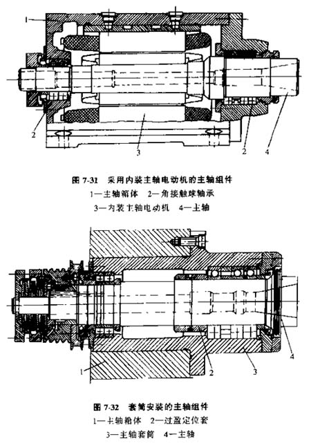 圖7-31所示是一種采用內(nèi)裝主軸電動(dòng)機(jī)的主軸組件(圖中為示出裝卸刀具及刀具夾緊機(jī)構(gòu)),簡化了主傳動(dòng)系統(tǒng)。7-32和圖7-33為用套筒安裝的主軸組件,這類主軸組件主軸支承跨距可以較短,主軸傳動(dòng)件位于主軸后部。