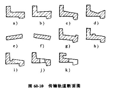(1) 軌道斷面,圖60-10為傳輸軌道斷面的基本形狀。圖中圖60-10c為下傾斜軌道,允許零件滾落到下級(jí)軌道上,圖60-10g軌道的下端設(shè)有能擋住零件的凸臺(tái);圖60-10h、i分別有能掛住零件的凸臺(tái)或凹槽;圖60-10j、k分別在送進(jìn)方向有長(zhǎng)的孔或槽。