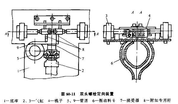 圖60-11中雙頭螺栓從振動(dòng)料斗6沿管道9前進(jìn)。在此雙頭螺栓之前,另有一個(gè)雙頭螺栓從振動(dòng)料斗進(jìn)入氣缸2推動(dòng)的供料接受器7,前一螺栓被后一螺栓的桿身或由接受器7的附加轉(zhuǎn)用桿隔離。移動(dòng)的雙頭螺栓由兩個(gè)彈簧作用的梳子供料。氣缸2在前面位置停下來(lái)后,氣缸3接通,將梳子4向兩個(gè)不同方向分開(kāi)。一對(duì)梳子均帶有齒頂不尖的雙頭螺栓,其中一個(gè)梳子處于同雙有螺栓的螺紋嚙和狀態(tài),另一個(gè)梳子沿著螺距較小的螺紋梳子面滑動(dòng)。移動(dòng)時(shí),雙頭螺栓將滑入底座1的橢圓窗孔并沿著接受槽(即管道5)進(jìn)入螺栓搬運(yùn)器,在進(jìn)入旋緊螺栓的工作機(jī)構(gòu)。第二個(gè)梳子由于螺距不同,不能與雙頭螺栓端部螺紋嚙合,因而停留在螺紋表面上。作為例外(當(dāng)螺栓直徑和質(zhì)量較大時(shí)),梳子螺紋和螺栓螺紋相同,但可能與螺栓不重合。但當(dāng)油缸活塞桿開(kāi)始運(yùn)動(dòng)時(shí),梳子就一定能與螺栓螺紋想嚙合。當(dāng)螺栓進(jìn)入梳子面下時(shí),雙頭螺栓在梳子牙條傾斜角作用下轉(zhuǎn)動(dòng),因此牙條與雙頭螺栓相嚙合始終不少于三個(gè)牙;而另一雙頭螺栓不進(jìn)行嚙合。