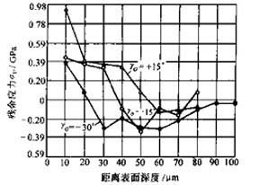 1) 刀具方面,當(dāng)前角由正值逐漸變?yōu)樨?fù)值時,表層的殘余拉應(yīng)力逐漸減小,但殘余應(yīng)力層的深度增大(見圖3-5)在一定的切削用量下,采用絕對值較大的負(fù)前角,可使已加工表面層得到殘余壓應(yīng)力(見圖3-6)