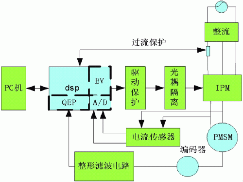 交流伺服數(shù)字化系統(tǒng)的硬件由DSP作為信號(hào)處理器,用旋轉(zhuǎn)編碼器和電流傳感器提供反饋信號(hào),智能功率模塊IPM作為逆變器,經(jīng)傳感器出來(lái)的信號(hào)經(jīng)過(guò)濾波整形等處理后反饋給DSP進(jìn)行運(yùn)算,DSP經(jīng)過(guò)對(duì)參考信號(hào)和反饋信號(hào)的處理運(yùn)算來(lái)調(diào)節(jié)伺服系統(tǒng)的電流環(huán),速度環(huán),和位置環(huán)的控制,最后輸出PWM信號(hào)經(jīng)過(guò)隔離驅(qū)動(dòng)IPM模塊實(shí)現(xiàn)電機(jī)的伺服閉環(huán)控制。 系統(tǒng)的硬件結(jié)構(gòu)如圖1所示。