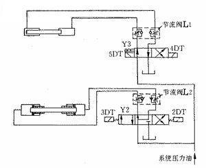 為解決問題,液壓系統(tǒng)從兩方面著手:①換向閥Y1重新選型;②在系統(tǒng)中增加速度調節(jié)環(huán)節(jié)。改造后的原理圖如圖2所示。選用國產24WE6D50/CFG24型電磁換向閥Y3替換Y1。閥Y3帶“記憶”功能,不因電磁鐵失電而改變閥芯位置。在Y3、Y2出油口處增加了節(jié)流閥組L1、L2,使變速油缸1、2獲得理想的運動速度。