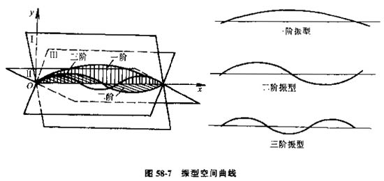 (1)撓性轉子動平衡原理,將撓性轉子簡化為一根簡支梁,梁在其彈性穩(wěn)定平衡位置附近會發(fā)生多種形式的微小振動,其中橫向振動是撓性轉子動平衡的理論基礎,整個轉子的振動位移,即動撓度曲線上一條繞如圖58-7所示的轉軸Oz,以角速度w回轉的空間曲線,可以視該曲線為無限多條固有頻率不同的振型曲線在空間疊加而成。各階振型曲線所在平面互不重合,圖58-7所示為三個振型的空間曲線。