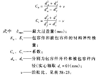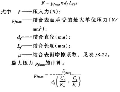 6)用壓力機(jī)壓入時(shí),壓入前應(yīng)根據(jù)零件的材料和配合尺寸,計(jì)算所需的壓入力。壓力機(jī)的壓力一般應(yīng)為所需壓入力的3~3.5倍,壓入力的計(jì)算方法如下: