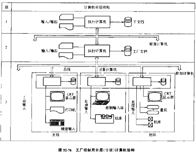 通常,柔性制造系統(tǒng)采取分層(級(jí))、分布式集中管理的控制結(jié)構(gòu),圖52-76表示了以多級(jí)計(jì)算機(jī)體系與結(jié)構(gòu)數(shù)據(jù)庫(kù)共享支撐下的分級(jí)管理塔。每一級(jí)計(jì)算機(jī)輔助一個(gè)相應(yīng)的管理層,計(jì)算機(jī)分為兩層或幾層,圖52-76為3級(jí)(層)計(jì)算機(jī)結(jié)構(gòu),圖52-77為4級(jí)計(jì)算機(jī)結(jié)構(gòu),一般公司級(jí)控制多用4級(jí)控制網(wǎng)絡(luò),工廠級(jí)控制多用3級(jí)分層控制網(wǎng)絡(luò)。對(duì)于柔性制造系統(tǒng),比較先進(jìn)的采用3級(jí)控制網(wǎng)絡(luò)。有時(shí)把計(jì)算機(jī)分層的級(jí)稱為控制級(jí)。
