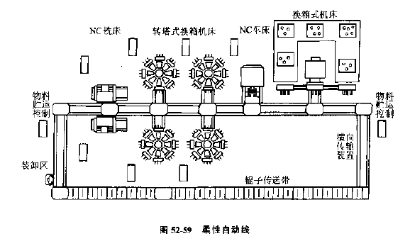 柔性自動線在加工過程中還有一定的生產(chǎn)節(jié)拍,工件沿一定的方向順序輸送,但在工件變換后,各機床的主軸箱可以自動進行相應的更換,同時調(diào)入相應的數(shù)控程序,此時生產(chǎn)節(jié)拍也可能作相應的調(diào)整。