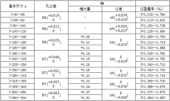 為了保證齒輪的傳動(dòng)精度,和防止齒輪孔與軸之間可能因產(chǎn)生間隙,而導(dǎo)致腐蝕現(xiàn)象,所以當(dāng)齒輪及采用H6,H7公差帶,軸采用h6公差帶時(shí),將軸的名義尺寸加一增大量,進(jìn)行輕熱配合,表1-146中所列的輕熱壓配合尺寸,僅適用于鍵聯(lián)結(jié)的情況下。