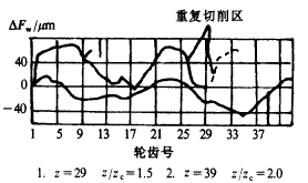 從圖2中可以看出,工件與插齒刀齒數(shù)比例關(guān)系z/zc對Fw值的影響。圖中表示出齒輪的測量結(jié)果,z=29的齒輪,在重復(fù)切削區(qū)里,公法線長度急劇變化,而z=39的齒輪未發(fā)現(xiàn)此情況,插齒刀齒數(shù)zc=20。