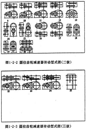 在工礦企業(yè)及運輸、建筑等部門中,圓柱齒輪減速器是一種應用極為廣泛的重要部件。通用型減速器,作為一種工業(yè)產品,規(guī)格較多,產量頗大。與此同時,在使用部門中還經常需要設計一些能滿足特定要求的專用減速器。為適應市場瞬息多變的要求,國家在“七五”期限間,將重型機械基礎件作為24項CAD攻關產品之一,并將減速器作為重型機械基礎件的代表。由西安重型機械研究所(后簡稱西重所)提供的專家系統(tǒng)文本中減速器的類型如下(圖1-1、圖1-2-1、圖1-2-2、圖1-2-3)。