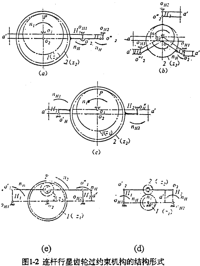 連桿行星齒輪傳動機構(gòu)還有如圖1-2所示的各種形式。圖1-1和圖1-2(a)、(b)、(d)、(e)均為平行四邊形機構(gòu),圖1-2(e)為反平行四邊形機構(gòu)。其中圖1-2(d)、(e)的連桿行星齒輪為外齒輪,其余均為內(nèi)齒輪。