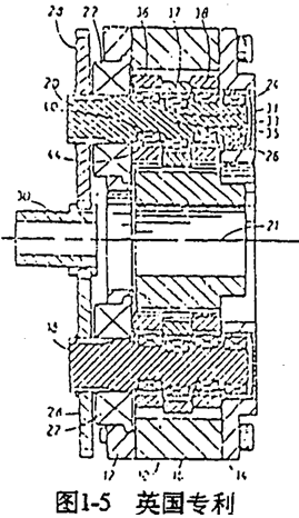 雙曲柄機構(gòu)中,如果在兩根曲軸上都有動力輸入,則“死點”位置也就自然不存在了。因此,可以通過一套定軸傳動機構(gòu)把動力從一輸入高速軸傳遞到另一高速軸,從而克服機構(gòu)“死點”。根據(jù)這種原理制成的雙曲柄輸入少齒差行星齒輪裝置之不理的類型很多,如太原工學院五十年代研制的雙曲柄輸入漸開線少齒差減速器(見圖1-4)、英國專利(見圖1-5)、、重慶鋼鐵公司研制的單齒環(huán)雙曲柄輸入少齒差減速器(見圖1-6)、日本松本和幸等人研制的RV減速器(見圖1-7)。其特點都是通過外嚙合齒輪副將輸入動力分流、傳遞到多個曲柄軸上,形式多軸輸入,從而克服“死點”。這種結(jié)構(gòu)的特點是其傳動比為定軸傳動的傳動比與少齒差行星齒輪傳動的傳動比之乘積,因而可以通過改變外嚙合齒輪的齒數(shù)方便函地滿足不同傳動比的要求,適應性強。其不足之處是結(jié)構(gòu)復雜,而且在高速軸之間存在兩平行傳動的剛性傳動鏈(外齒輪嚙合副和雙曲柄機構(gòu))對誤差比較敏感,加工精度要求很高。