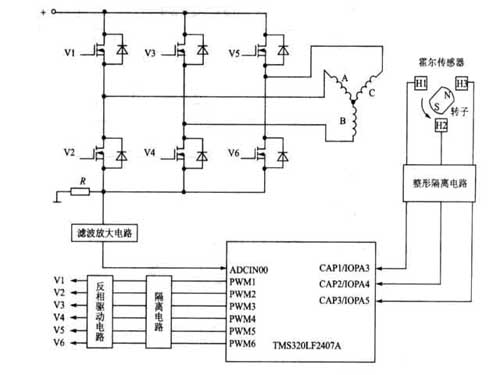 圖2 用TMS320LF2407A實(shí)現(xiàn)三相無(wú)刷直流電動(dòng)機(jī)調(diào)速的控制和驅(qū)動(dòng)