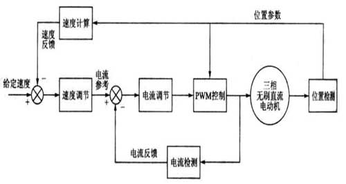 從理論上來(lái)看,直流無(wú)刷電動(dòng)機(jī)的速度和轉(zhuǎn)矩控制主要依據(jù)如下的轉(zhuǎn)矩和反電動(dòng)勢(shì)工程計(jì)算方程 其中,N為直流無(wú)刷電動(dòng)機(jī)定子每相線(xiàn)圈數(shù), 為轉(zhuǎn)子的長(zhǎng)度,r為轉(zhuǎn)子的內(nèi)徑,B為轉(zhuǎn)子的磁通密度, 為電動(dòng)機(jī)的角速度,i為相電流,L為相感抗, 為轉(zhuǎn)子的位置,R為相阻抗[5]。 從方程可以看到,反電動(dòng)勢(shì)與電動(dòng)機(jī)的轉(zhuǎn)速成比例,而轉(zhuǎn)矩與相電流也幾乎勢(shì)成比例的。根據(jù)這些特點(diǎn),在方案中采用了圖3所示的控制策略。給定轉(zhuǎn)速與速度反饋形成偏差,經(jīng)速度調(diào)節(jié)后產(chǎn)生電流參考量,它與電流反饋量的偏差經(jīng)電流調(diào)節(jié)后形成PWM占空比的控制量,實(shí)現(xiàn)電動(dòng)機(jī)的速度控制。電流的反饋是通過(guò)檢測(cè)電阻上的壓降來(lái)實(shí)現(xiàn)的。速度反饋是通過(guò)霍爾傳感器輸出的位置量,經(jīng)過(guò)計(jì)算得到的。位置傳感器輸出的位置量還用于控制換相。