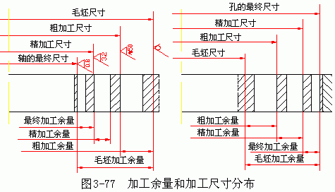 加工總余量也是個變動值,其值及公差一般可從有關(guān)手冊中查得或憑經(jīng)驗(yàn)確定。如圖 3-77 表示了內(nèi)孔和外圓表面經(jīng)多次加工時,加工總余量、工序余量與加工尺寸的分布圖。