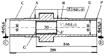 以軸套內(nèi)花鍵大徑為基準(zhǔn),用花鍵錐度芯軸大徑定位測量A、B、C、D各段外圓徑向跳動(dòng),用裝夾兩次的測量結(jié)果來判定軸套各段外圓徑向跳動(dòng)是否合格,規(guī)定一次裝夾和二次裝夾的測量結(jié)果都不允許超差。