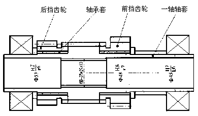 CPC2型叉車變速器,10%的產(chǎn)品在出廠試車時(shí)有異常響聲,不能順利過關(guān),經(jīng)檢查發(fā)現(xiàn)異常響聲從輸入軸總成(見圖1)中發(fā)出,并伴有齒輪與軸承套發(fā)生相對軸向位移和旋轉(zhuǎn)位移的現(xiàn)象。經(jīng)分析是一軸軸套內(nèi)花鍵大徑相對于軸套外圓徑向跳動(dòng)超差,導(dǎo)致軸承和前、后擋齒輪受擠壓所致。