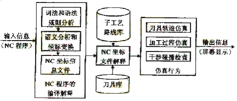 本文設(shè)計(jì)的數(shù)控車削仿真系統(tǒng)既可以對手工編制的單機(jī)數(shù)控車削程序進(jìn)行仿真,也可以作為CAD/CAPP/CAM集成制造系統(tǒng)中的一個(gè)子系統(tǒng),對集成制造系統(tǒng)自動(dòng)產(chǎn)生的數(shù)控車削程序進(jìn)行仿真。該系統(tǒng)可以完成對子程序的處理,允許運(yùn)動(dòng)坐標(biāo)的續(xù)效代碼和注釋行的存在,并且支持多種數(shù)控代碼格式,是一個(gè)通用的數(shù)控車削NC 程序仿真系統(tǒng),其工作流程如圖1所示。