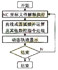 刀具軌跡動(dòng)態(tài)仿真是根據(jù)要進(jìn)行仿真的數(shù)控代碼,在計(jì)算機(jī)屏幕上動(dòng)態(tài)顯示刀具軌跡,以運(yùn)動(dòng)軌跡的方式來直觀顯示零件具體的加工過程;進(jìn)行刀具軌跡動(dòng)態(tài)仿真時(shí),順序讀入NC坐標(biāo)信息文件,獲取數(shù)控指令(直線、圓弧指令等)和命令參數(shù)(起點(diǎn)、終點(diǎn)和圓心坐標(biāo)等),然后執(zhí)行相應(yīng)的軌跡處理:對于直線和圓弧命令,則要根據(jù)其起止運(yùn)動(dòng)坐標(biāo),進(jìn)行直線和圓弧的插補(bǔ)運(yùn)算,得到運(yùn)動(dòng)過程中離散的中間點(diǎn)的坐標(biāo)值,然后動(dòng)態(tài)顯示刀具運(yùn)動(dòng)軌跡。刀具運(yùn)動(dòng)軌跡仿真算法流程如圖2所示。