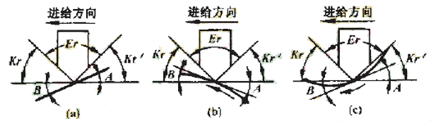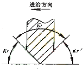 具體的干涉碰撞檢查算法,是在插值點(diǎn)將加工刀具的主偏角和副偏角與直線傾斜角度比較,對于圓弧段輪廓,則與該插值點(diǎn)在圓弧輪廓的切線的傾斜角進(jìn)行比較,并區(qū)分順圓和逆圓兩種情況。以右車刀切外輪廓為例,其對于直線和圓弧的干涉檢查如圖4所示。檢查結(jié)果將寫入一個(gè)干涉報(bào)告中,圖4中,kr為主偏角.kr'為副偏角,Er為刀尖角,A為與切削加工方向相反的傾斜角,B為與切削加工方向相同的傾斜角。當(dāng)A>kr時(shí),刀具副切削刃和零件表面發(fā)生干涉,當(dāng)180°+B<180°-kr時(shí),刀具的主切削刃和零件表面發(fā)生干涉,這時(shí)將發(fā)生過切現(xiàn)象二對于不同的加工方向和加工輪廓,上述判別式應(yīng)進(jìn)行相應(yīng)的調(diào)整。