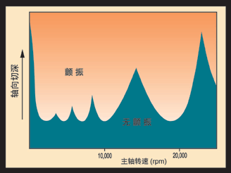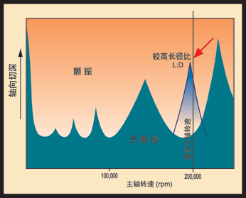 圖2 :該示意圖說(shuō)明了由刀具、刀夾及高速主軸組成的特定系統(tǒng)中轉(zhuǎn)速和切深之間的關(guān)系。對(duì)于任何一個(gè)這樣的系統(tǒng),主軸轉(zhuǎn)速的上部分預(yù)計(jì)可以提供一個(gè)或多個(gè)""有效擊球點(diǎn)"",其中可以采用非常高的切深。