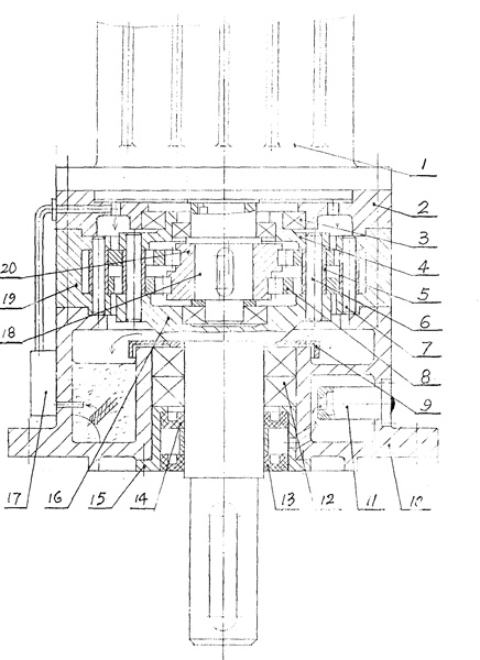 一種釜用不泄漏減速機(jī),由擺線輪[8]、輸入軸[18]、偏心軸承[20]、機(jī)座[10]、針齒輪及W輸出機(jī)構(gòu)組成,其中針齒輪由針齒殼[19],均布在針齒殼上的針齒[7]構(gòu)成,W機(jī)構(gòu)由輸出軸[16]與均布在輸出軸圓盤上的柱銷[6]及柱套[5]構(gòu)成,其特征在于: a)機(jī)座[10]內(nèi)有一儲(chǔ)油腔,機(jī)座外壁有一油泵[17]用來(lái)將儲(chǔ)油腔的潤(rùn)滑油泵至減速機(jī)頂端由上而下對(duì)機(jī)件進(jìn)行潤(rùn)滑; b)在輸出軸支承軸承[12]頂端有一圓環(huán)蓋[9],其高度高于儲(chǔ)油面1~3cm,用以防止從沿輸出軸漏油; c)在輸出軸軸承[12]下端有一個(gè)密封組件,它由套筒[15]及裝在套筒內(nèi)的密封[13]、[14]構(gòu)成,二密封之間要有一定空間,密封組件用以防止有毒介質(zhì)從反應(yīng)釜中泄漏到減速機(jī)內(nèi)腔。