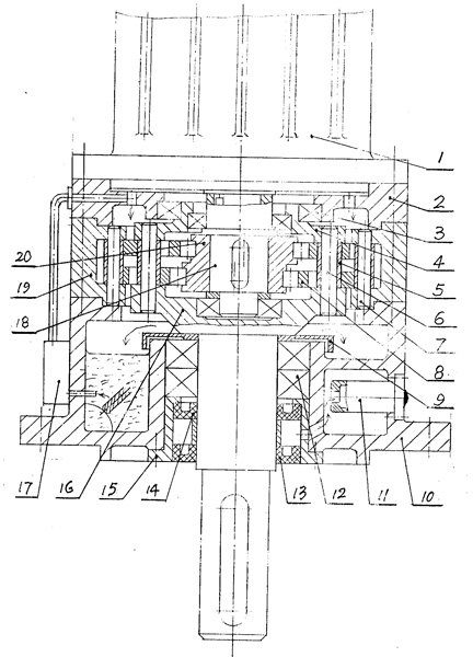 | 一種釜用不泄漏減速機(jī),由擺線輪[8]、輸入軸[18]、偏心軸承[20]、機(jī)座[10]、針齒輪及W輸出機(jī)構(gòu)組成,其中針齒輪由針齒殼[19],均布在針齒殼上的針齒[7]構(gòu)成,W機(jī)構(gòu)由輸出軸[16]與均布在輸出軸圓盤上的柱銷[6]及柱套[5]構(gòu)成,其特征在于: a)機(jī)座[10]內(nèi)有一儲(chǔ)油腔,機(jī)座外壁有一油泵[17]用來將儲(chǔ)油腔的潤(rùn)滑油泵至減速機(jī)頂端由上而下對(duì)機(jī)件進(jìn)行潤(rùn)滑; b)在輸出軸支承軸承[12]頂端有一圓環(huán)蓋[9],其高度高于儲(chǔ)油面1~3cm,用以防止從沿輸出軸漏油; c)在輸出軸軸承[12]下端有一個(gè)密封組件,它由套筒[15]及裝在套筒內(nèi)的密封[13]、[14]構(gòu)成,二密封之間要有一定空間,密封組件用以防止有毒介質(zhì)從反應(yīng)釜中泄漏到減速機(jī)內(nèi)腔。 |