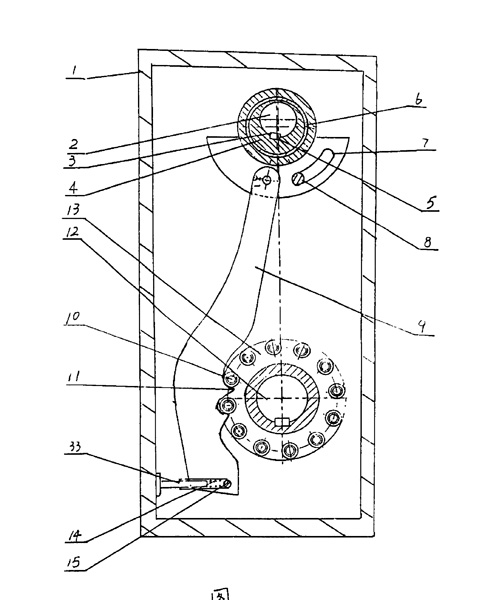 | 一種減速機(jī),包括輸入軸、主動(dòng)輪、被動(dòng)輪、輸出軸、殼體,其特征是上述所述的主動(dòng)輪是有3至10個(gè)偏心輪(4)組成,每個(gè)偏心輪(4)內(nèi)孔固定在所述的輸入軸(2)上,每個(gè)偏心輪(4)外園上設(shè)置外套(32),每個(gè)外套(32)上分別連接連桿(27)位于殼體(1)內(nèi)一側(cè),每個(gè)連桿(27)連接能與滾輪(13)邊緣上的滾子輪(10)嚙合的鉤齒板(16);在工作時(shí)至少有1個(gè)鉤齒板(16)和滾輪(13)邊緣上的滾子輪(10)嚙合,上述所述的被動(dòng)輪是邊緣上裝有滾子輪(10)的滾輪(13)固定上輸出軸(12)上,滾輪(13)邊緣上滾子輪(10)的軸向排數(shù)大于或等于鉤齒板(16)數(shù),在連桿(27)上設(shè)置有定位槽(24),固定銷(21)設(shè)置在連桿(27)定位槽(24)內(nèi)位于殼體(1)內(nèi),或者每個(gè)連桿(27)上設(shè)有能與滾輪(13)邊緣上的滾子輪(10)嚙合的鏈齒(11),在工作時(shí)至少有1個(gè)鏈齒(11)和滾輪(13)邊緣上的滾子輪(10)嚙合,鉤齒板(16)背面設(shè)置有彈性復(fù)位裝置。 |