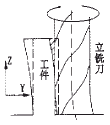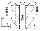 平行雙主軸加工方案由日本巖部洋育等人提出。由于銑削力的作用,工件的側(cè)壁會(huì)產(chǎn)生“讓刀”變形(見圖2),因此,應(yīng)用一個(gè)立銑刀很難實(shí)現(xiàn)薄壁零件的高精加工。常規(guī)的小進(jìn)給量和低切深的方法雖然可以滿足一定的加工精度, 但是效率比較低。平行雙主軸方案可以有效的解決單一主軸加工零件的變形問題。該方法需要同時(shí)應(yīng)用兩個(gè)回轉(zhuǎn)半徑、有效長(zhǎng)度及螺旋升角大小相同的立銑刀, 刀刃分別為左旋和右旋(見圖3)。采用平行雙主軸加工方案,由于工件兩側(cè)受力為對(duì)稱力, 所以除了微量的刀具變形引起的加工誤差以外, 工件的加工傾斜變形基本上可以消除。