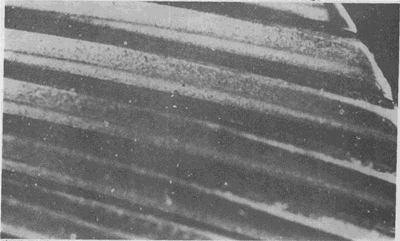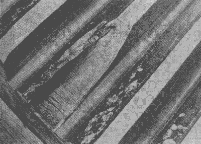 輪齒齒面在滑動方向上形成的帶狀粗糙部分。它的粗糙度隨輕度膠合而變化。齒面間潤滑油膜的破裂能導(dǎo)致齒面間局部焊合,并伴有齒面材料遷移。