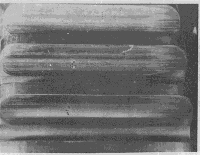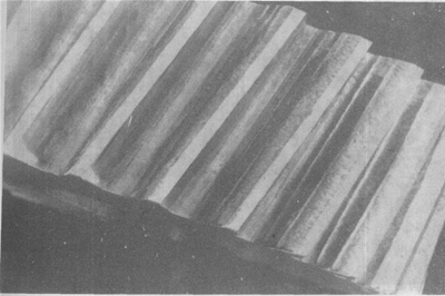 輪齒的滾壓塑變。圖為一從動齒輪,其齒面上工作節(jié)曲面附近明顯的隆起清晰可見。