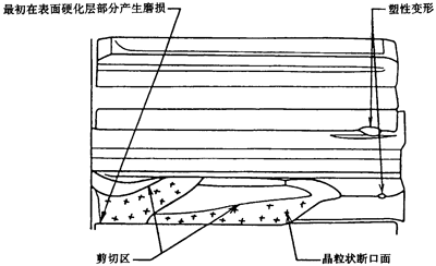 由于裂紋通常在表層與心部的過渡區(qū)延伸,致使大塊表層材料碎片逐漸脫落。