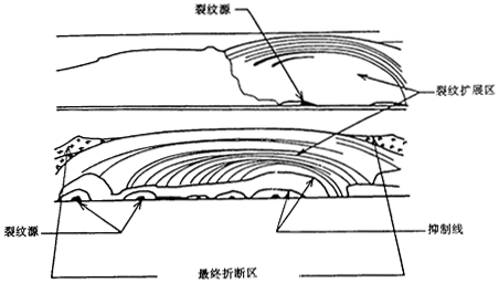 斷口面分為兩個不同的區(qū)域,疲勞斷口面和最終斷口面。在疲勞區(qū)內(nèi)看不到塑性變形痕跡,斷口面平滑、無光澤,有時由于被抑制線分割,可顯現(xiàn)出裂紋擴展各連續(xù)階段的間隔區(qū)。