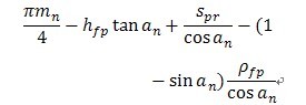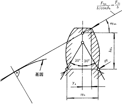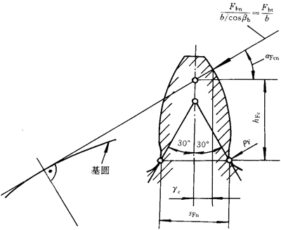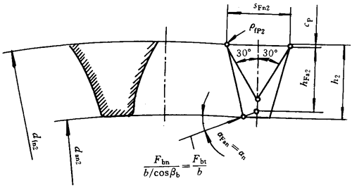 ρF——30°切線切點(diǎn)處曲率半徑。外齒輪由式(182)計(jì)算,內(nèi)齒輪由式(195)計(jì)算。