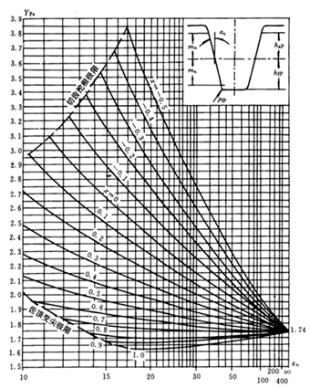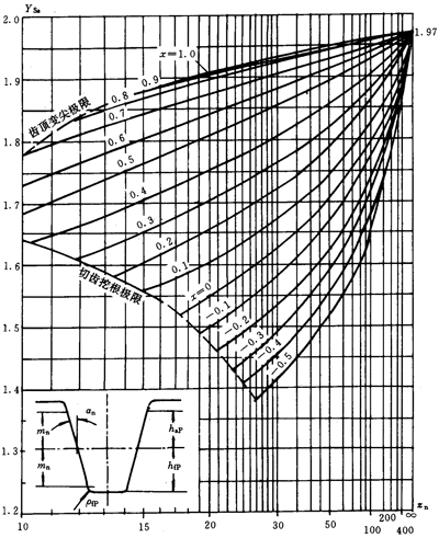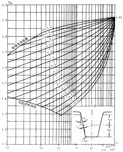 應(yīng)力修正系數(shù)Ys和Ysa是將名義彎曲應(yīng)力換算成齒根局部應(yīng)力的系數(shù)。它考慮了齒根過渡曲線處的應(yīng)力集中效應(yīng),以及彎曲應(yīng)力以外的其他應(yīng)力對齒根應(yīng)力的影響。