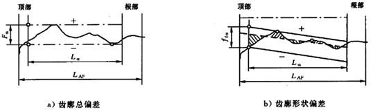 在被測(cè)軸截面上(垂直于基圓柱軸線(xiàn)的截面)齒廓評(píng)定范圍內(nèi),包容實(shí)際齒廓線(xiàn)的兩條最近的理論齒廓線(xiàn)(圖中點(diǎn)劃線(xiàn))間的距離,在理論齒廓線(xiàn)的法線(xiàn)方向計(jì)值,以Fα表示(見(jiàn)圖3a)。