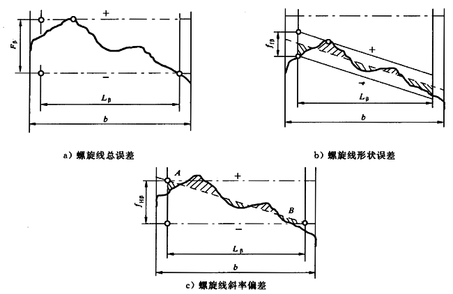 在被測圓柱面上,過評定范圍兩端交平均螺旋線A、B兩點的兩條理論螺旋線間的差值以fHβ表示(見圖6c)。