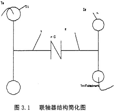為了便于求解運動微分方程,需要對傳動軸系中聯(lián)軸器的主動和從動兩側(cè)的轉(zhuǎn)動慣量和剛度作力學(xué)模型的簡化。根據(jù)具體結(jié)構(gòu)情況,可以將軸系簡化為若干個等效轉(zhuǎn)動慣量圓盤,以具有某一剛度的周聯(lián)系起來。通常比較典型的是簡化為兩個等效的圓盤,配置在聯(lián)軸器的兩側(cè)。并設(shè)定所聯(lián)兩軸的剛性很大,只有聯(lián)軸器具有彈性和阻尼。如圖3.1所示