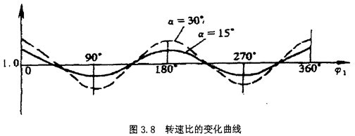 當(dāng)主動轉(zhuǎn)子的回轉(zhuǎn)角速度為常數(shù)時,從動轉(zhuǎn)子的角速度是偏角和主動轉(zhuǎn)子轉(zhuǎn)角的函數(shù)。當(dāng)或ф