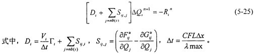 方程(5-24)可以采用顯式或隱式的方法進(jìn)行求解。但是由于受時間步長的限制,采用顯式的R-K時間推進(jìn)方法需要迭代的步數(shù)較多,計算很不經(jīng)濟(jì),因此本文采用了Gauss-Seidel迭代隱式求解的方法。