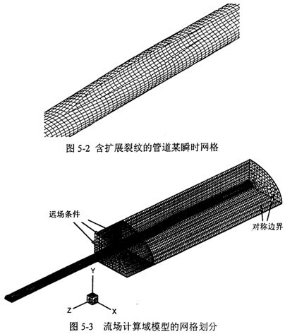 圖5-3是以圖5-2為依據(jù)建立的流場計算網(wǎng)格。設(shè)計參數(shù)為:裂紋擴(kuò)展速度200m/s,管道外徑1016mm,壁厚14.7mm,內(nèi)壓10MPa。