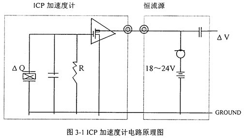 典型的集成壓電式(ICP)加速度計是在傳統(tǒng)的壓電加速度計基礎(chǔ)上耦合一個以場效應管為核心的內(nèi)裝放大器電路所構(gòu)成。電路原理如圖3-1所示。ICP加速度計除了能帶來使用方便操作簡化的優(yōu)越性外,較傳統(tǒng)的壓電加速度計還具有如下一系列的優(yōu)點: