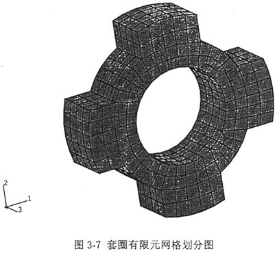 套圈是一個不規(guī)則的零件,先用有限元按三維八節(jié)點實體單元對它進行網(wǎng)格劃分,圖3-7是有限元網(wǎng)格劃分圖。邊界條件是這樣處理的:由于套圈裝在減速機箱體孔中時,和孔的配合是過盈配合,且套圈內(nèi)表面與傳動軸外表面也是過盈配合,故套圈的配合面處均按固支對待。經(jīng)ABAQUS有限元軟件處理后輸出質(zhì)量矩陣和剛度矩陣,然后用廣義的Collatz包含定理求出它的低階固有頻率。