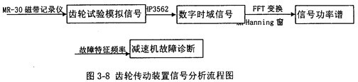 圖3-8是齒輪傳動裝置信號分析流程圖,用HP3562動態(tài)數(shù)字分析儀采集MR-30磁帶記錄儀紀錄的二級圓柱斜齒輪減速機試驗過程中的模擬信號,可得到齒輪傳動裝置載荷、齒輪傳動裝置箱體動態(tài)激勵力應變變化的時域信號,對此信號作FFT變換,可得到載荷譜和動態(tài)激勵力應變變化時域信號的功率譜。為了防止功率譜泄露,在作FFT變換時,需作加窗處理,由于試驗采集的是隨機信號,故加漢寧(Hanning)窗處理。利用故障診斷特征參數(shù)一傳動零件可能發(fā)生故障的振動頻率及其振動頻率處的功率對試驗信號進行診斷分析。當功率譜所包含的頻率成份難以區(qū)分時,可采用倒譜分析。