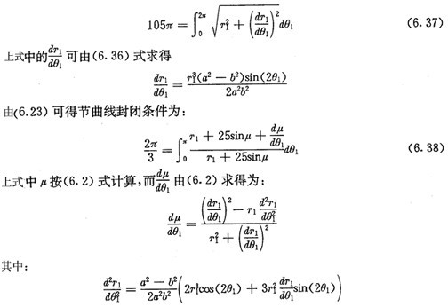 從以上設(shè)計(jì)過程可以看出,根據(jù)非圓太陽輪設(shè)計(jì)行星輪為圓的純滾動非圓行經(jīng)齒輪傳動機(jī)構(gòu)時,并不是對任意指定的太陽輪節(jié)曲線都有解。當(dāng)太陽輪節(jié)曲線的周期數(shù)n1給定后,節(jié)曲線必須有兩個可調(diào)整的參數(shù)(例中的a和b)的要由節(jié)曲線的封閉條件及輪齒等分條件來確定。齒輪模數(shù)m和太陽輪齒數(shù)z1是被預(yù)先指定了的。當(dāng)各參數(shù)求出后,要用不干涉條件(6.28)式進(jìn)行校驗(yàn),若發(fā)生干涉,應(yīng)調(diào)整z1數(shù)值,重新計(jì)算太陽輪的可調(diào)整參數(shù)。