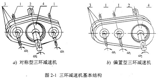 星型少齒差減速機(jī)雖然只有一片內(nèi)齒環(huán)板,結(jié)構(gòu)簡單,易于滿足傳力條件和裝配條件。但是它的環(huán)板軸承所受載荷在傳遞相同的輸出扭矩的情況下比對稱型、偏置型三環(huán)減速機(jī)大很多,環(huán)板及其軸承較易損壞,在設(shè)計(jì)和實(shí)際使用中應(yīng)避免采用這種結(jié)構(gòu)布置形式。