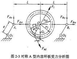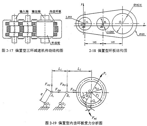 其次分析偏置型三環(huán)減速機(jī)的情況,圖2-17所示為偏置型三環(huán)減速機(jī)傳動(dòng)結(jié)構(gòu)圖,偏置型三環(huán)減速機(jī)的一塊環(huán)板的結(jié)構(gòu)如圖2-18所示,它的受力情況和坐標(biāo)系選取如圖2-19所示,符號(hào)的標(biāo)定及含義同對稱型三環(huán)減速機(jī)。